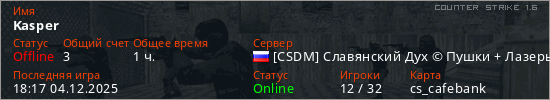 Играет на Counter Strike 1.6 сервере. Страна: РоссияПервый раз замечен 19:09 29.09.2025