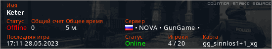 Играет на Counter Strike Source сервере. Страна: РоссияПервый раз замечен 17:09 28.05.2023