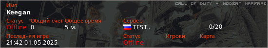 Играет на Call of Duty 4: Modern Warfare сервере. Страна: РоссияПервый раз замечен 21:40 01.05.2025