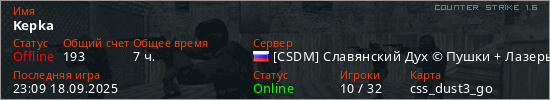 Последний раз был в сети 23:09 18.09.2025 Игрок с таким ником замечен на 6 серверах