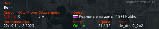 Играет на Counter Strike 1.6 сервере. Страна: РоссияПервый раз замечен 22:15 11.12.2023