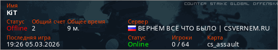 Играет на Counter Strike Global Offensive сервере. Страна: РоссияПервый раз замечен 19:14 05.03.2026
