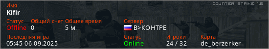 Играет на Counter Strike 1.6 сервере. Страна: РоссияПервый раз замечен 05:29 06.09.2025