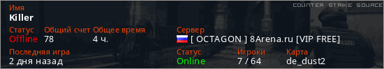 Играет на Counter Strike Source сервере. Страна: РоссияПервый раз замечен 12:50 19.09.2021