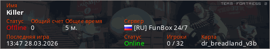 Играет на Team Fortress 2 сервере. Страна: РоссияПервый раз замечен 13:43 28.03.2026