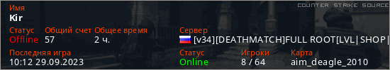 Играет на Counter Strike Source сервере. Страна: РоссияПервый раз замечен 15:24 02.08.2023