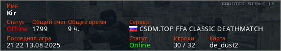 Играет на Counter Strike 1.6 сервере. Страна: РоссияПервый раз замечен 17:09 25.10.2021