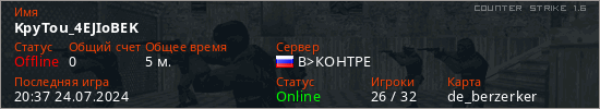 Играет на Counter Strike 1.6 сервере. Страна: РоссияПервый раз замечен 20:31 24.07.2024
