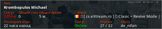 Играет на Counter Strike 1.6 сервере. Страна: РумынияПервый раз замечен 20:38 16.01.2026