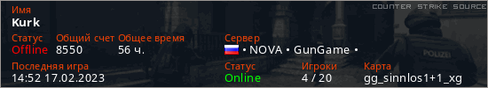 Играет на Counter Strike Source сервере. Страна: РоссияПервый раз замечен 15:38 22.10.2022