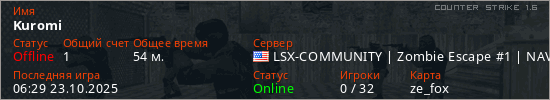 Играет на Counter Strike 1.6 сервере. Страна: СШАПервый раз замечен 04:55 05.08.2025