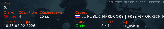 Играет на Counter Strike Global Offensive сервере. Страна: РоссияПервый раз замечен 15:20 02.02.2025