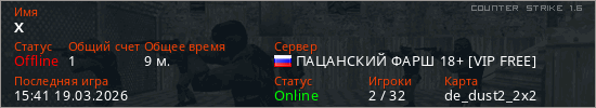 Играет на Counter Strike 1.6 сервере. Страна: РоссияПервый раз замечен 13:26 15.03.2026