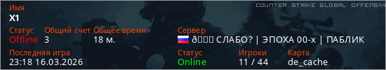 Играет на Counter Strike Global Offensive сервере. Страна: РоссияПервый раз замечен 23:49 12.03.2026
