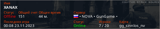 Играет на Counter Strike Source сервере. Страна: РоссияПервый раз замечен 13:02 09.11.2022