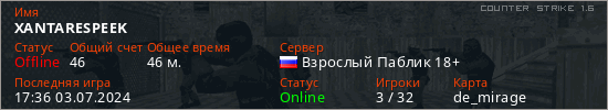 Играет на Counter Strike 1.6 сервере. Страна: РоссияПервый раз замечен 12:07 07.07.2021