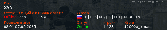 Играет на Counter Strike 1.6 сервере. Страна: РоссияПервый раз замечен 13:32 24.05.2022