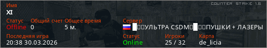Играет на Counter Strike 1.6 сервере. Страна: РоссияПервый раз замечен 20:34 30.03.2026