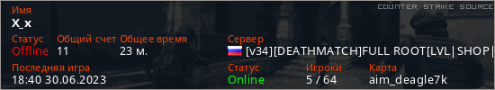 Играет на Counter Strike Source сервере. Страна: РоссияПервый раз замечен 11:42 16.01.2023