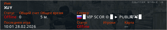 Играет на Counter Strike 1.6 сервере. Страна: РоссияПервый раз замечен 09:44 28.02.2026