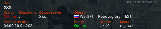 Играет на Counter Strike 1.6 сервере. Страна: РоссияПервый раз замечен 03:56 20.04.2024