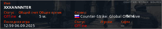 Играет на Counter Strike Source сервере. Страна: РоссияПервый раз замечен 12:57 06.09.2025