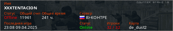 Играет на Counter Strike 1.6 сервере. Страна: РоссияПервый раз замечен 11:02 08.09.2021