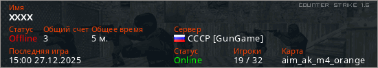Играет на Counter Strike 1.6 сервере. Страна: РоссияПервый раз замечен 14:58 27.12.2025