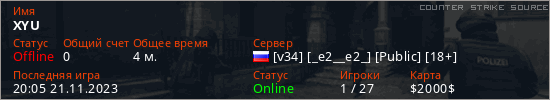 Играет на Counter Strike Source сервере. Страна: РоссияПервый раз замечен 19:22 21.11.2023