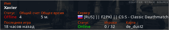 Играет на Counter Strike Source сервере. Страна: РоссияПервый раз замечен 19:24 12.02.2026