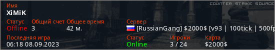 Играет на Counter Strike Source сервере. Страна: РоссияПервый раз замечен 11:15 13.07.2023