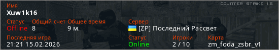 Играет на Counter Strike 1.6 сервере. Страна: УкраинаПервый раз замечен 19:05 15.02.2026