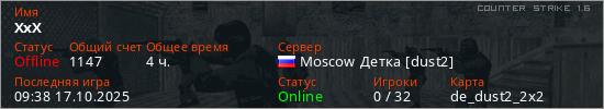 Играет на Counter Strike 1.6 сервере. Страна: РоссияПервый раз замечен 11:37 24.12.2021