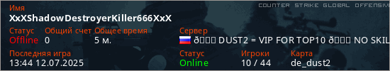 Играет на Counter Strike Global Offensive сервере. Страна: РоссияПервый раз замечен 13:41 12.07.2025