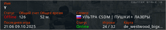 Играет на Counter Strike 1.6 сервере. Страна: РоссияПервый раз замечен 12:38 01.11.2024