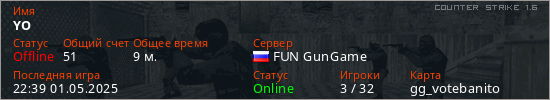 Играет на Counter Strike 1.6 сервере. Страна: РоссияПервый раз замечен 21:40 01.05.2025