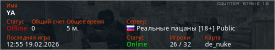 Играет на Counter Strike 1.6 сервере. Страна: РоссияПервый раз замечен 12:53 19.02.2026