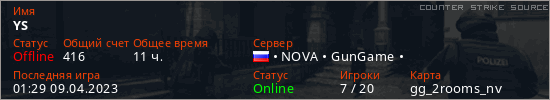 Играет на Counter Strike Source сервере. Страна: РоссияПервый раз замечен 21:06 11.08.2022