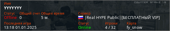 Играет на Counter Strike 1.6 сервере. Страна: РоссияПервый раз замечен 13:10 01.01.2025