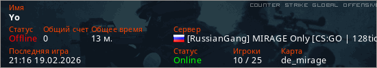 Играет на Counter Strike Global Offensive сервере. Страна: РоссияПервый раз замечен 12:59 14.02.2026