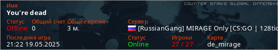 Играет на Counter Strike Global Offensive сервере. Страна: РоссияПервый раз замечен 21:22 19.05.2025