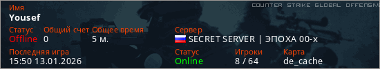 Играет на Counter Strike Global Offensive сервере. Страна: РоссияПервый раз замечен 15:48 13.01.2026
