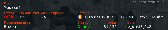 Играет на Counter Strike 1.6 сервере. Страна: РумынияПервый раз замечен 19:19 19.04.2025