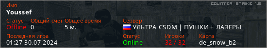 Играет на Counter Strike 1.6 сервере. Страна: РоссияПервый раз замечен 01:25 30.07.2024