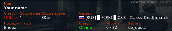 Играет на Counter Strike Source сервере. Страна: РоссияПервый раз замечен 19:39 18.11.2025