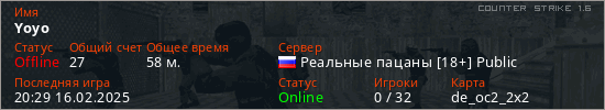 Играет на Counter Strike 1.6 сервере. Страна: РоссияПервый раз замечен 17:29 04.11.2023