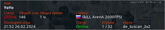 Играет на Counter Strike 1.6 сервере. Страна: РоссияПервый раз замечен 18:29 03.11.2023