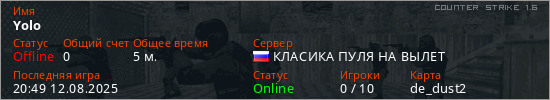 Играет на Counter Strike 1.6 сервере. Страна: РоссияПервый раз замечен 20:14 12.08.2025