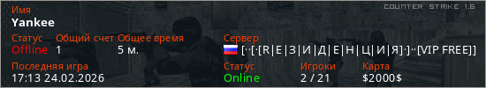 Играет на Counter Strike 1.6 сервере. Страна: РоссияПервый раз замечен 17:09 24.02.2026