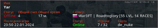 Играет на Counter Strike 1.6 сервере. Страна: РоссияПервый раз замечен 21:49 14.12.2023